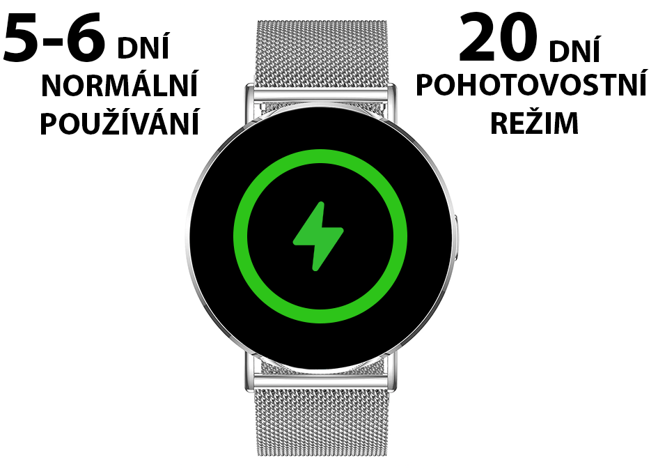 Výdrž hodinek je vynikající – na jedno nabití vydrží až 5-6 dní. V pohotovostním režimu se výdrž prodlouží až na 20 dní. Takže se nemusíte bát častého nabíjení a můžete si užívat všechny funkce naplno.
